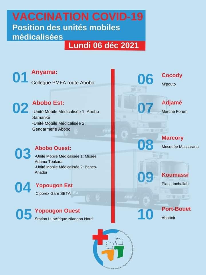 A la date du 6 décembre 2021, la Côte d’Ivoire compte donc 61 826 cas confirmés dont 60 875 personnes guéries, 706 décès et 238 cas actifs.