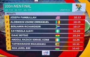 Soulignons que Koné Abdoul Razack Ismaël, le deuxième finaliste ivoirien a fini 6e en 10.25 s chez les hommes.Ce dimanche, place au relais 4×100 m masculin avec une sélection ivoirienne engagée.