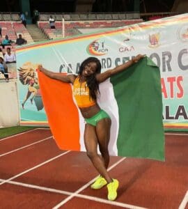 Cette fois ,c’est la bonne ! Tombée au pied du podium (4e) il y a deux ans en Île Maurice ,la » petite bombe « du sprint féminin en Côte-d’Ivoire se juche sur le podium à Douala .