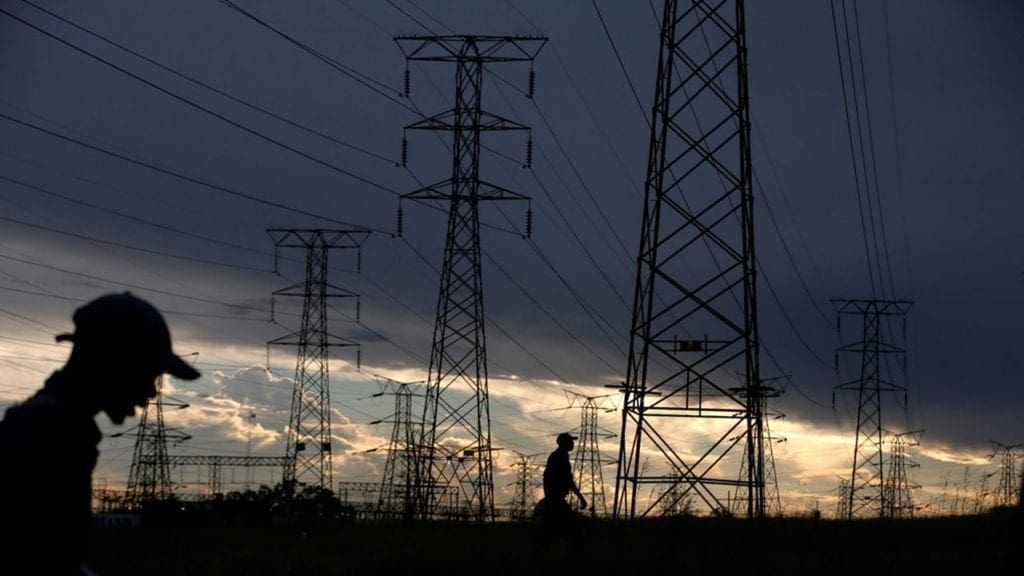 FILE PHOTO: Men walk past electricity pylons as they return from work in Orlando, Soweto township, South Africa March 18, 2019. REUTERS/Siphiwe Sibeko/File Photo - RC13EDEAEFB0