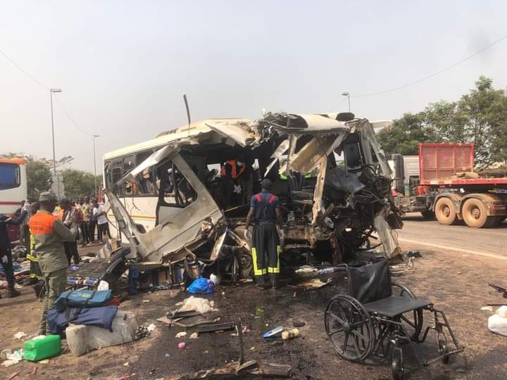 Il s’agit d’une collision entre deux cars de transport qui a endeuillé plusieurs familles.La 5e compagnie du Groupement des Sapeurs Pompiers Militaires (GSPM) présente sur les lieux indique 14 morts dont 9 hommes et 5 femmes.