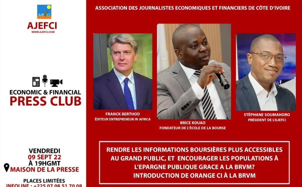 Il coule de source que les différentes populations ne sont pas réellement au fait de ce que c’est que les bourses ,leurs déclinaisons et leurs différentes implications. Et cela n’est un secret pour personne.C’est donc pour  » rendre les informations boursières plus accessibles au grand public et encourager les populations à l’épargne publique grâce à la BRVM » que l’association des journalistes économiques et financiers de Côte d’Ivoire ( AJEFCI) avec sa tête Stéphane SOUMAHORO organise son premier Press Club. Ce sera ce vendredi 09 septembre à la maison de la Presse. Cette activité d’envergure enregistra les participations de Franck BERTHOD Éditeur Entrepreneur In AFRICA et Brice KOUAO ,le fondateur de l’Ecole de la Bourse .À ces hôtes s’ajoutent  la BRVM et d’autres invités de marque sans oublier le premier responsable de l’AJEFCI et toute son équipe.