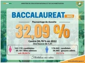 32,09 % ! C’est le taux de réussite au baccalauréat cette session 2023.Ce,soit une hausse de 1,31% par rapport à la session 2022 qui a enregistré 30,78% .Sur 340.213 candidats présents dans 551 centres de composition, 109.166 ont été déclarés admis pour cette session 2023.