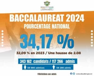 Abidjan, le 08 juillet 2024(Abidjanpress)-Les résultats du baccalauréat session 2024 en Côte d’Ivoire ont été proclamés ce lundi 08 juillet comme annoncé.Et c’est un taux de succès de 34,17% qui a été enregistré.