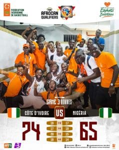 Vainqueurs du Bénin (74-59) pour son entrée en lice ,puis la Guinée (88-64) lors de leur deuxième sortie et le Nigéria (74-65),les Éléphants locaux compostent leurs tickets.