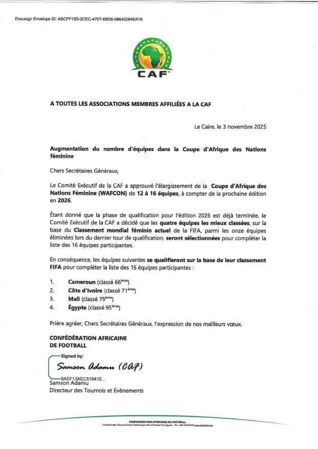 La CAF précise que, la phase de qualification pour l’édition 2026 étant déjà achevée, quatre équipes supplémentaires seront retenues pour compléter la liste des 16 nations participantes, sur la base du classement mondial féminin actuel de la FIFA.