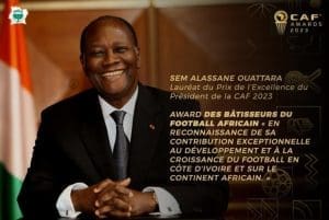 SEM Alassane Ouattara a été honoré par la Confédération Africaine de Football (CAF) » En reconnaissance à sa contribution exceptionnelle au développement et à la croissance du football en Côte d’Ivoire et sur le continent africain« .Présent à Marrakech, le ministre délégué des sports et du cadre de vie, Adjé Silas Metch a réceptionné le trophée du Président de la République de Côte-d’Ivoire.
