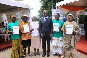 En guise de conclusion de cette cérémonie, l’AFOR a procédé à une remise symbolique de 32 Certificats Fonciers à leurs bénéficiaires, sur un total de 1 069 Certificats Fonciers obtenus durant la phase pilote du PAMOFOR dans la région du N’ZI.