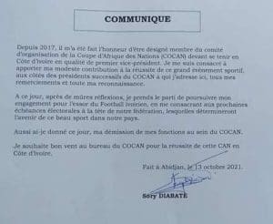 Dans un communiqué publié ce 13 octobre 2021, M. Sory Diabaté le désormais ex premier Vice-président du Comité d’organisation de la Coupe d’Afrique des nations (Cocan 2023) en Côte d’Ivoire a rendu sa démission.L’ex second et homme de main de feu Augustin Sidy Diallo entend plus que jamais mobiliser toutes ses forces pour les prochaines échéances électorales à la présidence de la Fédération ivoirienne de football (FIF).