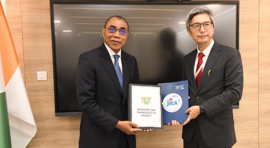 Abidjan, le 20 mars 2024(CICG) – Le ministre des Finances et du Budget, Adama Coulibaly et le représentant-résident de l’Agence japonaise de coopération internationale (JICA) en Côte d’Ivoire, Wakabayashi Motoharu, ont paraphé, le mardi 19 mars 2024, un accord de prêt portant sur un montant de 10 milliards FCFA, destiné à financer la construction du Terminal céréalier du Port autonome d’Abidjan.