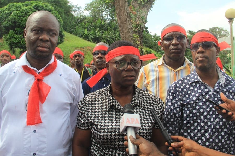 Avec des bandeaux rouges, des membres du collectif des 123 agents licenciés, ont organisé au terme de cette AG extraordinaire, un sit-in d’une heure dans l’enceinte du groupe Fraternité Matin pour exprimer leur mécontentement.