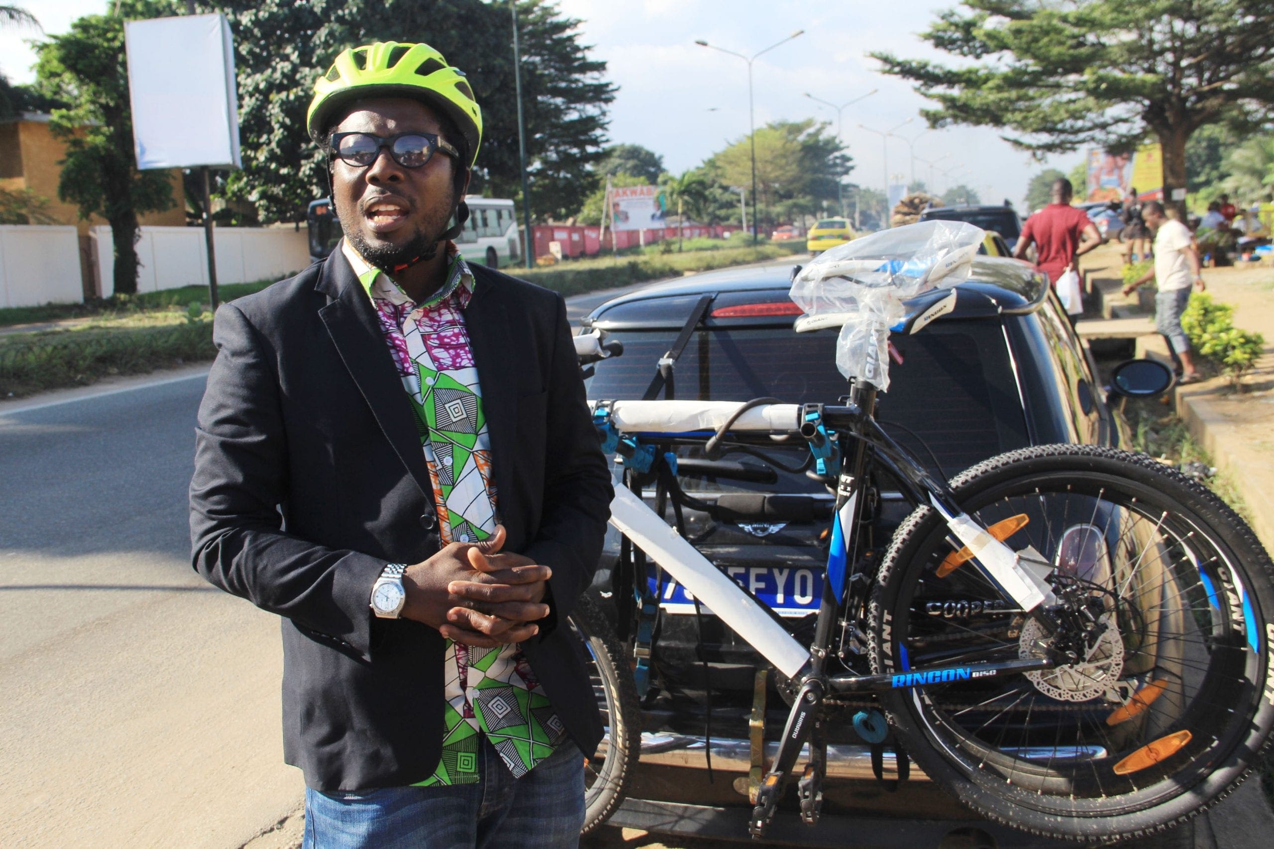 Une petite voiture de luxe sur laquelle sont accrochés deux vélos. Arrivé à destination, le conducteur cherche un parking et détache un vélo pour effectuer ses courses. Lui, c’est Andy Costa, remarquable par son casque cycliste, l’éco reporter, « l’Ambassadeur du vélo en Afrique et Président de l’ONG My Dream for africa », se présente-t-il.