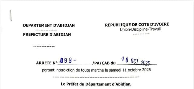 Par arrêté préfectoral n°093/PA/CAB signé ce vendredi 10 octobre 2025, le Préfet du Département d’Abidjan, M. Andjou KOUA, a annoncé l’interdiction de toute marche ou manifestation sur la voie publique prévue pour le samedi 11 octobre 2025, sur toute l’étendue du territoire d’Abidjan.