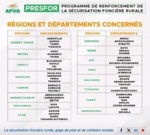 Il bénéficiera à 4 millions de personnes reparties dans 16 régions de la Côte d’Ivoire. Il s’agit du Worodougou, le Lôh-Djiboua, la Nawa, le Poro, le Gontougo, le Tonkpi, le Cavally, le Tchologo, le Moronou et le Guémon. À ces régions ,s’ajoutent l’Agnéby-Tiassa, le Bafing, l’Indénié-Djuablin, la Mé, le N’Zi, le Sud-Comoé qui étaient couvertes par le Projet d’amélioration et de mise en œuvre de la politique foncière rurale (PAMOFOR). Ce sont au total 52 départements, 218 sous-préfectures et 3 353 villages qui sont concernés par cet ambitieux projet qu’est le PRESFOR.