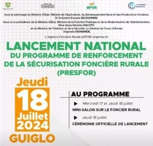 Le 18 juillet 2024, le Programme de renforcement de la sécurisation foncière rurale (PRESFOR) a été officiellement lancé à Guiglo. C’est un programme quinquennal couvrant la periode 2024-2029. Le PRESFOR permettra de délivrer gratuitement 500.000 certificats fonciers sur 5 millions d’hectares de terres, de délimiter 3353 territoires de village et de signer 250.000 contrats agraires.
