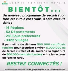 Le 03 Août 2016, l’Agence Foncière Rurale (AFOR) voit le jour conformément au Décret N° 2016-590 . Cette entité a pour principale mission, la mise en œuvre de la loi 98-750 relative au domaine foncier rural. L’AFOR prend un nouvel envol à partir du 2 août 2017 ,date de l’avènement du Ministre BAMBA Cheick Daniel en qualité de Directeur général. Sous le leader du Préfet Hors Grade et ancien ministre de l’intérieur, les projets et programmes pleuvent.