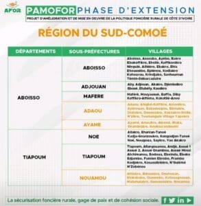 Le PAMOFOR a couvert six (06) régions dont l’Agnéby-Tiassa, le Bafing, l’Indénié-Djuablin, la Mé, le N’Zi et le Sud-Comoé, 19 Départements, 53 Sous-préfectures et 665 villages.
