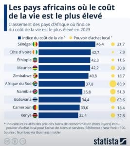 Avec un indice du coût de la vie de 42,7 et un pouvoir d’achat local de 7,8,la Côte d’Ivoire est la deuxième nation africaine où le coût de la vie est le plus onéreux. Elle arrive derrière le Sénégal premier avec un indice du coût de la vie de 46,4 et un pouvoir d’achat local de 21,7.Avec 42,3 comme indice du coût de la vie et 11,6 en pouvoir d’achat local,l’Éthiopie complète le podium.