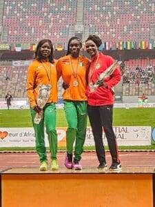 Jessika Gbaï croque le succès à pleine à Douala ! Vainqueure de la 3e série des demi-finales en 22.80 s,la sprinteuse ivoirienne spécialiste du 200 m se hisse au sommet en finale en 22.84 s devant sa compatriote KonéMaboundou ( 22.99s ; 2e).« Je suis heureuse c’est tout. C’est ma première participation aux championnats d’Afrique. Après la victoire à la CAN, je me suis dit partout où les Ivoiriens vont, on doit gagner. Tout ce que je fais, c’est pour la Côte d’Ivoire», s’est-elle rejéuie avant de porter ce message à toute la nation ivoirienne. «Mon message aux Ivoiriens : En dépit de toute situation, il faut toujours donner le meilleur de soi » . » Jess » décroche là son deuxième sacre sur le continent africain pour sa deuxième compétition en terre africaine après la médaille d’or cueillie aux IXes de la Francophonie, l’an dernier, sans oublier l’argent sur le 100 m.