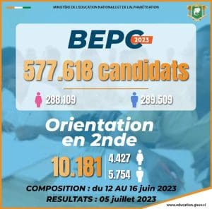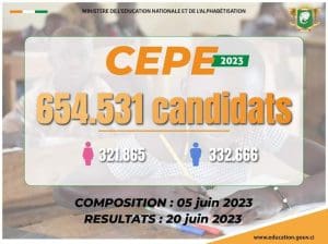 Le Certificat d’Etudes Primaires Élémentaires (CEPE) ouvrira le bal le lundi 05 juin 2023.Les résultats sont attendus le 20 juin prochain.S’en suivront les compositions du BEPC entre le 12 et 16 juin avant les résultats prévus pour être connus le 05 juillet.Les épreuves écrites du Baccalauréat quant à elles se dérouleront du 03 au 07 juillet .Les résultats eux ,seront proclamés le 24 juillet.