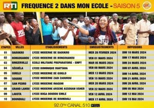 La caravane de la saison 5 de « Fréquence 2 dans mon école » s’ouvre avec le lycée moderne de Daoukro, avant celui de Bongouanou,l’EMPT de Bingerville, le lycée Dominique Ouattara de Séguéla, le lycée moderne de Guiglo,Zadi Zaourou de Soubré et Inagohi de San Pedro pour la 7e étape. Suivront le lycée moderne Arsène Assouan Usher de Grand-Lahou,puis le Emile Boga Doudou de Lakota et enfin le lycée moderne de Boundiali.