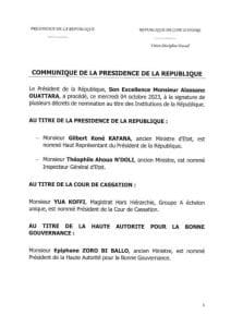 Ainsi ,M.Gilbert Koné KAFANA est nommé Haut Représentant du Président de la République. Ancien maire et Ministre d’État,il devient le tout premier pensionnaire de ce poste nouvellement créé.Toujours au chapitre de la présidence, M.Théophile Ahoua N’DOLI est nommé Inspecteur Général de l’État.