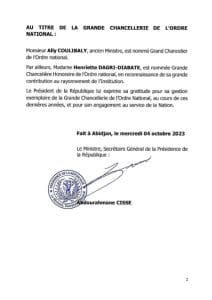 Pour ce qui est de la Grande Chancellerie de l’Ordre National, c’est désormais l’ancien ministre Ally COULIBALY qui en est le patron.Il remplace à la tête de cette institution Mme Henriette DAGRI-DIABATÉ,nommée Grande Chancellière Honoraire de l’Ordre National.