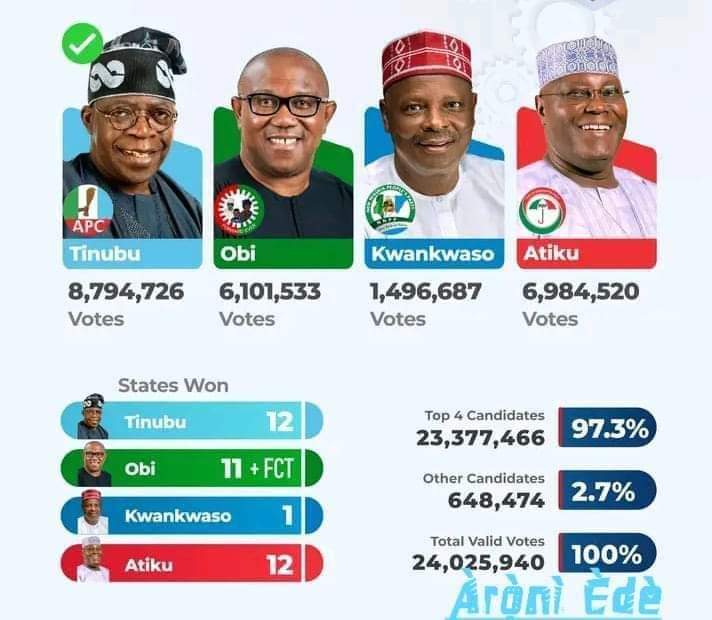 La maison»Actualité»LA COMMISSION ELECTORALE INDEPENDANTE NIGERIANE (INEC) A DECLARE VAINQUEUR DE L’ELECTION PRESIDENTIELLE DU 25 FEVRIER DERNIER, LE CANDIDAT DU PARTI AU POUVOIR APC, AHMED BOLA TINUBU