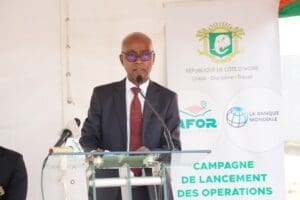 M. Mathias KOFFI, le Directeur des Opérations Techniques de l’AFOR, a représenté le Ministre BAMBA Cheick Daniel à Duékoué. Le Directeur Général de l’AFOR a dû rentrer à Abidjan la veille, pour un agenda de dernière minute. Son collaborateur qui portait son message, a expliqué le contenu du PRESFOR et présenté ses spécificités dans le Guémon. M. KOFFI est revenu sur les dispositions de la loi de 1998 sur le domaine foncier rural, en mettant en relief le pouvoir de décision que cette loi offre aux populations locales, réunies au sein des Comités Villageois de Gestion Foncière Rurale.