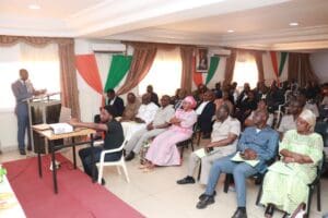 Bien avant, le volet protocolaire a marqué cette réunion publique avec l’allocution de bienvenue du 7e adjoint au Maire de Korhogo, M. Salifou COULIBALY, les messages du Conseil régional du Poro et du Ministre, Gouverneur du District Autonome des Savanes, délivrés respectivement par Dr Fatoumata BAMBA, 5e Vice-Présidente du Conseil régional, et M. SORO Kayaha Jérôme, 1er Vice-Gouverneur. Puis, le volet technique a été assuré par le Ministre BAMBA Cheick Daniel et M. DIALLO Sékou, Directeur Général du Cabinet de Géomètre-Expert DIALLO Sékou, Opérateur Foncier, recruté et retenu pour la région du Poro.