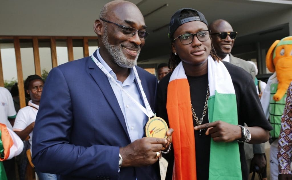 Parée d’or au championnat du monde féminin G4 Open en Arabie Saoudite le samedi 27 novembre dernier au terme d’une finale qu’elle a parfaitement maîtrisée,Ruth Gbagbi Marie Christelle (-67 kg) est rentrée ce mardi 30 novembre avec son coach chérif Adama CN 7e DAN .Un premier sacre de la double médaillée de bronze olympique dans la quête de son ticket pour Paris 2024, qui est la première médaille d’or de l’ère Jean-Marc YACÉ, fraîchement installé dans le fauteuil de President de la FITKD.Cette cérémonie en l’honneur de la championne Ruth Gbagbi qu’a abritée le siège de la FITKD logé au coeur du Centre Sportif Alassane OUATTARA (Palais du Taekwondo) revêt donc un caractère singulier pour le nouveau patron du taekwondo ivoirien.