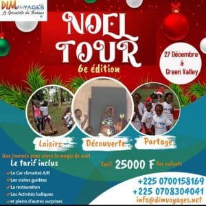 « Notre particularité est que nous avons toujours un nouveau site à faire découvrir à tout un chacun.Le » Noël Tour » consiste en la découverte de loisirs et de partage.Le loisir nous permet de mieux comprendre ce que nous faisons.La découverte rentre dans notre vision de promouvoir et valoriser nos différents sites touristiques.Le partage quant à lui renvoie à l’amour.Noël ,c’est l’amour.Noël ,c’est un moment où on partage » ,nous confiait dans une interview Mme Gbanet ,la Directrice Générale de DIM Voyages .Qui ajoute « Nous avons choisi le 27 décembre parce qu’on se dit que beaucoup d’enfants ont reçu des cadeaux mais il y a certaines personnes qui n’ont pas pu vivre la joie et le concept féerique de Noël.C’est donc pour montrer l’amour du partage en plus de tous les ingrédients autour pour leur faire vivre la véritable magie de Noël.Nous vous invitons à venir découvrir ce que nous proposons au cours de ce gros événement. »