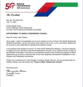 Conformément aux articles 6.2 et 6.7.3 des Statuts mondiaux de taekwondo, j’ai le plaisir de vous nommer membre du Conseil mondial de taekwondo en votre qualité de coprésident du Comité des athlètes. J’espère que vous vous consacrerez au progrès continu du Taekwondo mondial alors que nous nous efforçons de devenir l’une des fédérations internationales les plus respectées dans les mouvements olympiques et paralympiques.