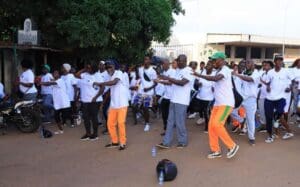 Marche sportive de la préfecture jusqu’au terrain du groupe scolaire de Dioulakro et séances de fitness, étaient les principales activités sportives de cette journée dont le thème était :Le sport, notre arme contre le cancer.