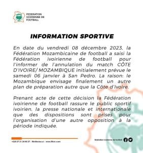 « En date du vendredi 8 décembre 2023, la Fédération Mozambicaine de Football a saisi la Fédération Ivoirienne de Football pour l’informer de l’annulation du match Côte d’Ivoire/Mozambique initialement prévue le samedi 6 janvier à San Pedro. La raison : Le Mozambique envisage finalement un autre plan de préparation autre que la Côte d’Ivoire. (…) Des dispositions sont prises pour l’organisation d’une autre opposition à la période indiquée », lit-on dans le communiqué.