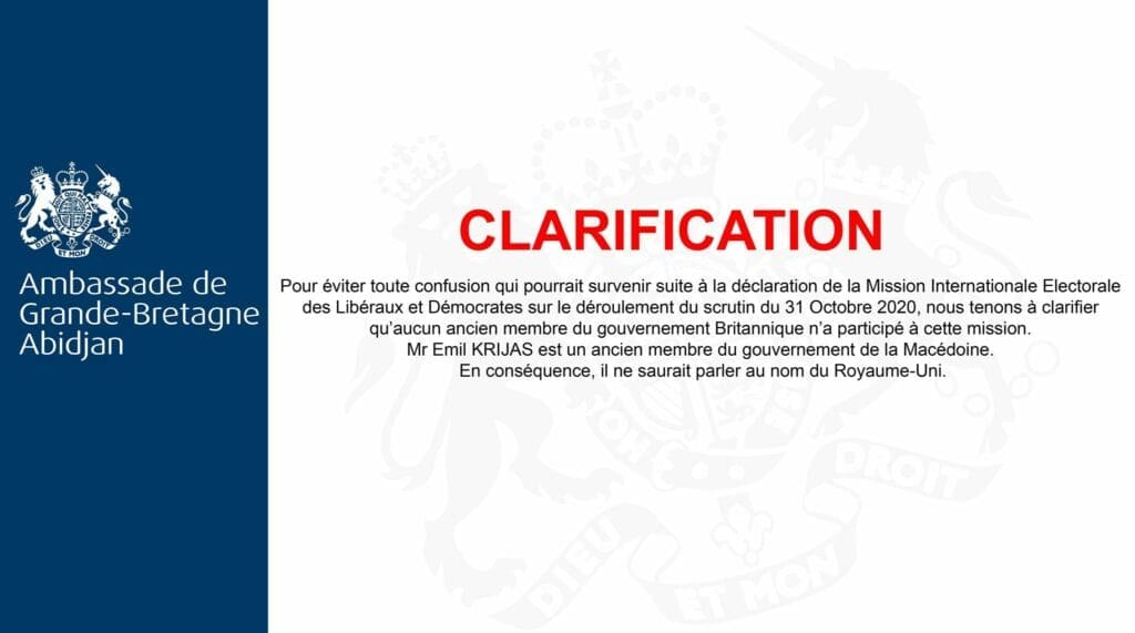 Pour éviter toute confusion qui pourrait survenir suite à la déclaration de la Mission Internationale Electorale des Libéraux et Démocrates sur le déroulement du scrutin du 31 Octobre 2020, l’Ambassade du Royaume-Uni de Grande Bretagne en Côte d’Ivoire tient à clarifier qu’aucun ancien membre du gouvernement Britannique n’a participé à cette mission. Mr Emil KRIJAS est un ancien membre du gouvernement de la Macédoine. En conséquence, il ne saurait parler au nom du Royaume-Uni.