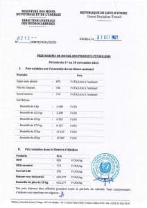 Abidjan,le 02 novembre 2023(Abidjanpress)-Le ministère des mines,du Pétrole et de l’énergie a publié les prix maxima de détail des produits pétroliers applicables du 1er au 30 novembre.Il ressort en qu’il n’y a aucune variation.