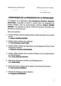 Ceux qui quittent le gouvernement sont au nombre de cinq (5).Il s’agit Mme Kandia Camara,fraîchement élue présidente du Sénat,M.Kouadio Konan Bertin (KKB), M.Danho Paulin, M.Épiphane Zoro Ballo et M.Jean-Luc Assi.