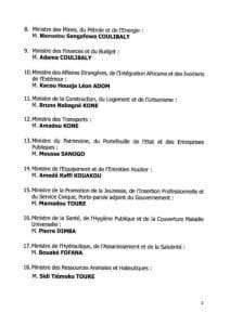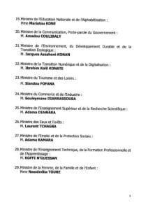 Il est fort de 31 ministres et 2 ministres délégués dont 06 femmes.On y note quatre (4) nouveaux ministres à savoir :Adjé Silas Metch ,ministre délégué auprès du Premier ministre chargé des sports et du cadre de vie;Assahoré Konan Jacques,Ministre de l’environnement ,du développement durable et de la transition Écologique; M.Wautabona Ouattara,ministre délégué chargé de l’intégration africaine et des Ivoiriens de la diaspora.Le quatrième nouvel entrant est M.Konaté Khalil Ibrahim.Il est le ministre de Transition Numérique et de la digitalisation.