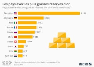 Le trio de tête du classement mondial est composé des États Unis avec 8133 tonnes ,l’Allemagne (3.358 tonnes ) et l’Italie avec 2.452 tonnes d’or.Les pays bas sont dixième mondial avec 612 tonnes.