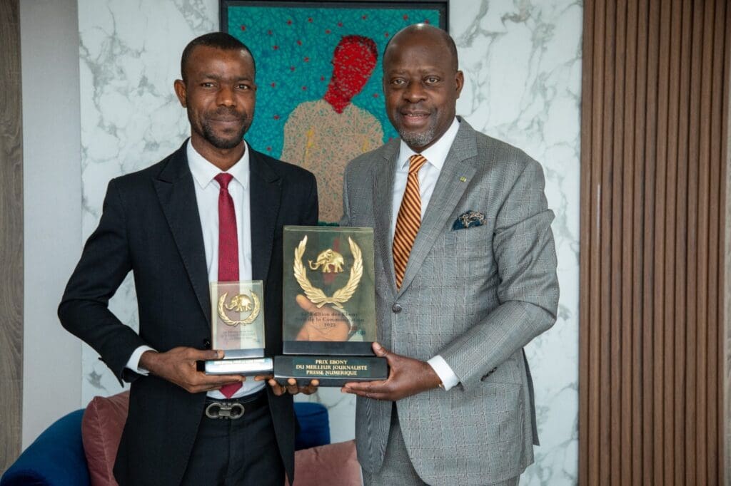 Le président du RJICCE Elvis GOUZA a présenté ses deux prix glanés à la dernière nuit de la communication, à savoir le Prix Ebony de la presse Numérique 2023 et le Prix Spécial de la lutte contre les Changements Climatiques et la Transition Ecologique.