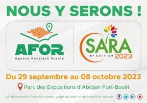 Abidjan,le 28 septembre 2023(Abidjanpress)-La 6e édition du Salon international de l’Agriculture et des Ressources Animales ( SARA) se tiendra au parc des Expositions d’Abidjan Port-Bouët.Ce sera du 29 septembre au 08 octobre 2023.Présente aux grands rendez-vous pour porter la bonne nouvelle de sécurisation foncière rurale, l’Agence Foncière Rurale animera un stand .