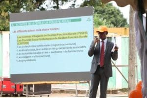 Pendant plus d’une heure et trente minutes, sur l’esplanade de la salle des fêtes de la Mairie d’Issia, le Directeur des Opérations Techniques de l’AFOR, M. Mathias KOFFI, a expliqué aux populations mobilisées en grand nombre, les procédures d’enregistrement des terres et d’obtention des Certificats Fonciers. La délimitation des territoires de villages, la Certification Foncière, le rôle des Comités Villageois de Gestion Foncière Rurale et la contractualisation, tout a été expliqué dans les moindres détails, à la grande satisfaction de l’assistance. En témoigne, le standing ovation qui a sanctionné sa communication.