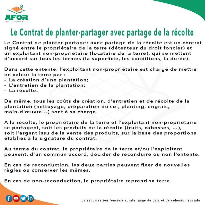 Partager Facebook Twitter WhatsApp Télégramme E-mail Copier Le Lien AFOR le contrat de Planter-partager avec partage de récolte Sécurisation foncière rurale