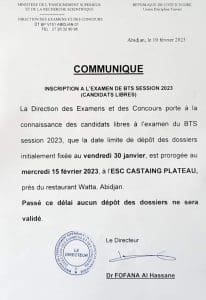 » La direction des examens et concours porte à la connaissance des candidats libres à l’examen du BTS session 2023 ,que la date limite de dépôt de dossiers initialement fixée au vendredi 30 janvier ,est prorogée au mercredi 15 février 2023″ , lit-on dans un communiqué publié sur les réseaux sociaux du ministère de l’enseignement supérieur et de la recherche scientifique signé du Dr FOFANA Al Hassane.
