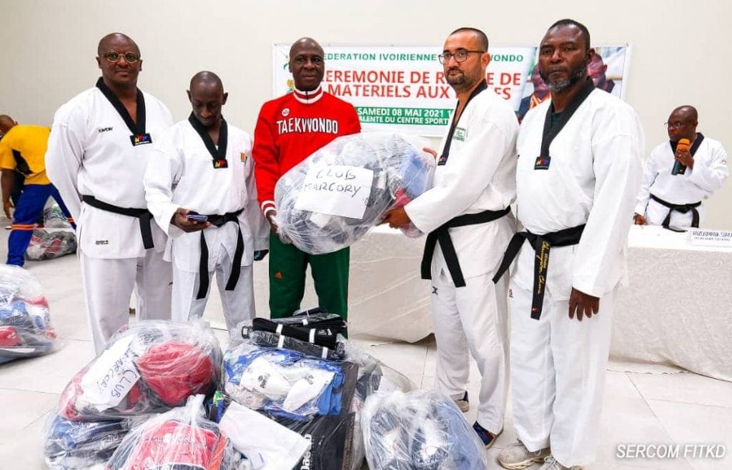 Après la Commission Formation-Évaluation et l’Administration Fédérale qui ont eu l’honneur d’ouvrir l’agenda de réception des équipements offerts par le Champion Olympique Cissé Cheick Sallah Junior, c’est au tour des Ligues de la FITKD de recevoir ce samedi 8 mai 2021, de la part de la Fédération Ivoirienne de Taekwondo au nom de Cissé Cheick leurs kits de matériels de Taekwondo à la salle polyvalente du Centre sportif ivoiro-coréen. Et c’est le Président de la FITKD, Me Bamba Cheick himself qui a présidé cette sobre et sympathique cérémonie qui a vu la présence de tous les Responsables des 26 Ligues de Côte d’Ivoire dont 16 de l’intérieur et 10 du District d’Abidjan.