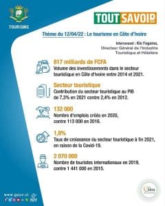 817 milliards de francs CFA ! C’est le volume des investissements réalisés dans le secteur touristique en Côte d’Ivoire dans la fourchette de 2014 à 2021.L’information a été rendue publique par le Dr Klo Fagama, Directeur général de l’industrie touristique et hôtelière,qui était l’invité le mardi 12 avril de  » Tout savoir sur… »,la tribune du Centre d’information et de communication gouvernementale ( CICG).