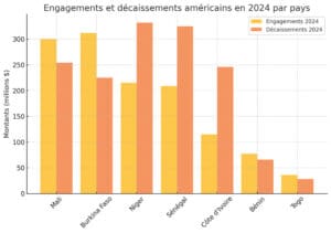 Moins touchés par l’instabilité politique, le Sénégal et la Côte d’Ivoire avaient jusqu’ici su tirer profit de leur position de partenaires stratégiques des États-Unis. Dakar, qui avait reçu 209 millions de dollars d’engagements en 2024, s’était même vu octroyer 325 millions $ (décaissements). En Côte d’Ivoire, 115 millions de dollars avaient été promis, et 246 millions avaient été décaissés, preuve d’un soutien grandissant.