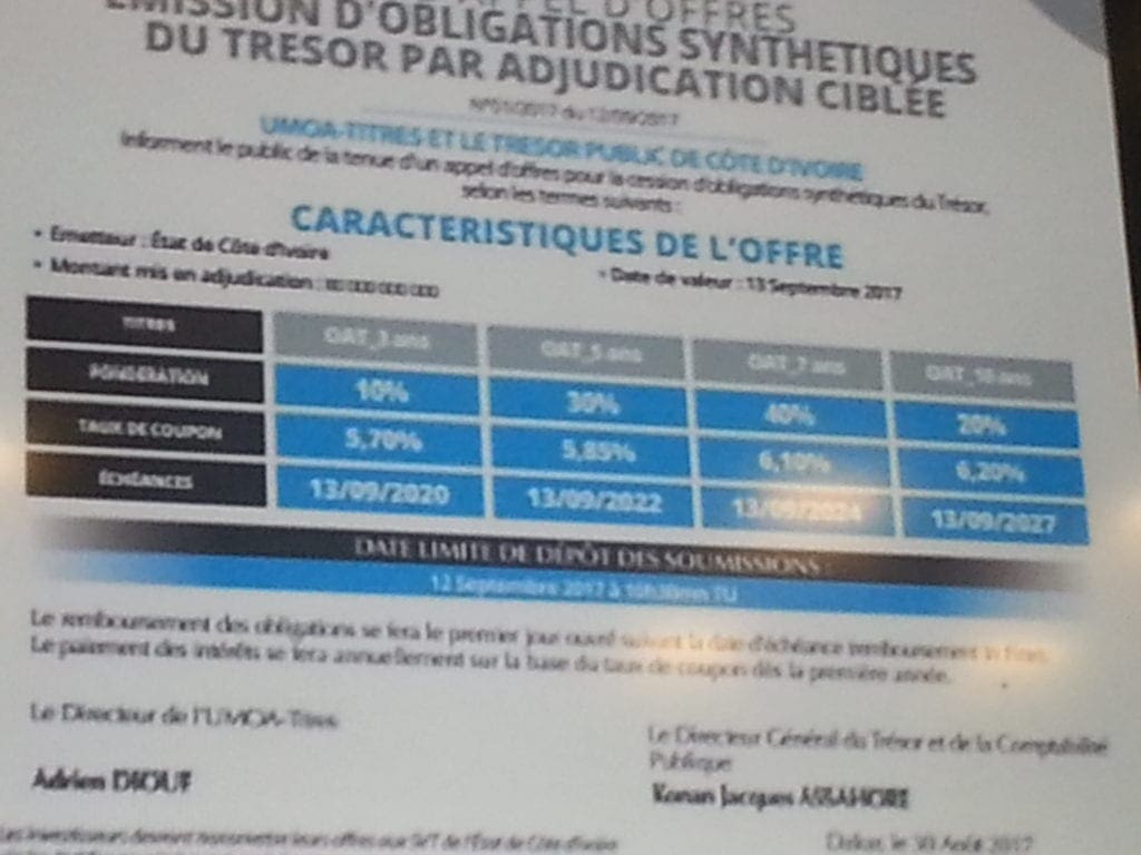 Il s’agit d’une émission d’obligation synthétique par adjudication ciblée d’un montant de 80 milliards de Fcfa et dont les taux varient entre 5,70% et 6,20% selon la maturité.