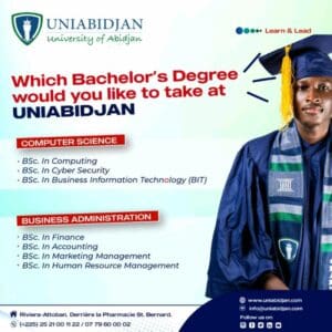 UNIABIDJAN est une université privée Bilingue. Elle allie le programme français (LMD) et anglais (Bachelor et MBA). Les Finances ,l’Économie, le Marketing, l’Informatique, la Comptabilité, la Gestion de l’Administration ainsi que les Ressources Humaines et le Management sont les champs d’expression de UNIABIDJAN.